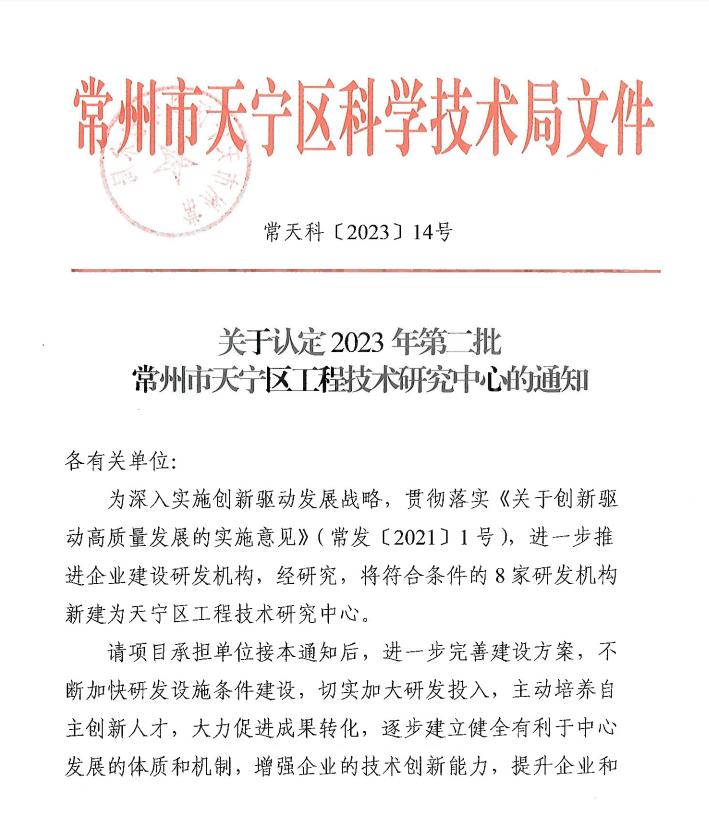 喜讯!热烈祝贺我司被认定为天宁区工程技术研究中心